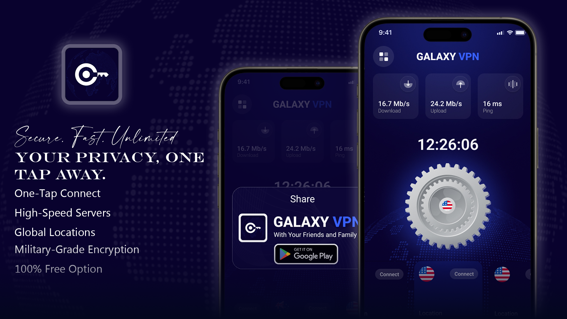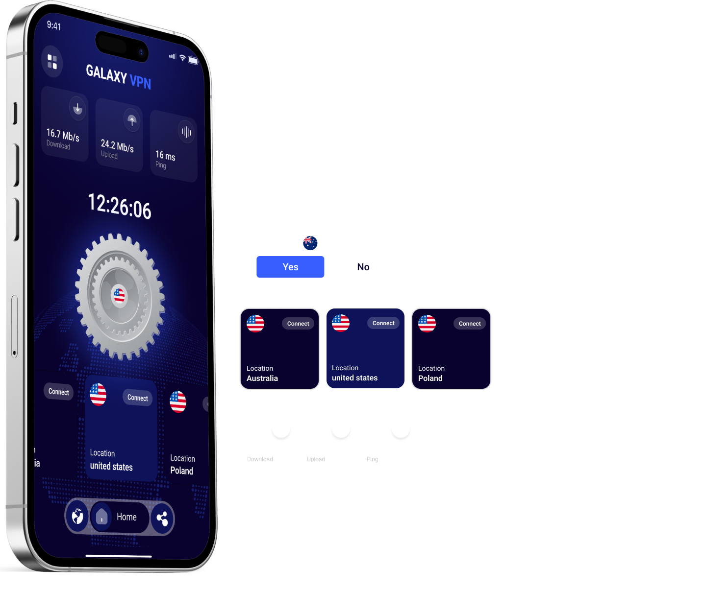 Upload & download speed visuals for a more advanced connection screen.