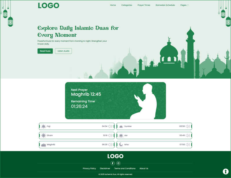 MyIslamic Way is a spiritually-focused Islamic website created to offer Muslims a serene and accessible space for their daily religious practices. The project centers around delivering authentic duas, accurate prayer timings, Islamic reminders, and devotional content through a minimalist, responsive, and user-friendly platform.